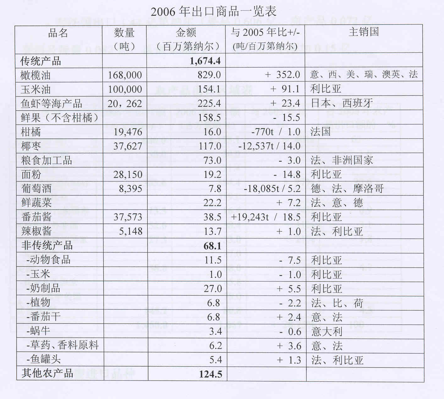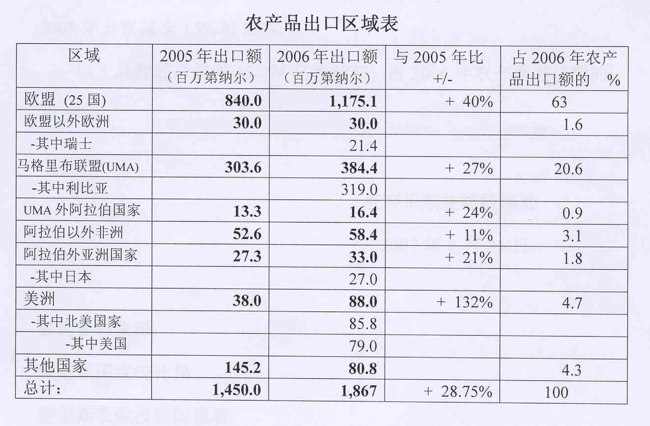 2006年出口4大传统市场(意大利、利比亚、西班牙、法国)占农产品出口总额76.5%。其中: